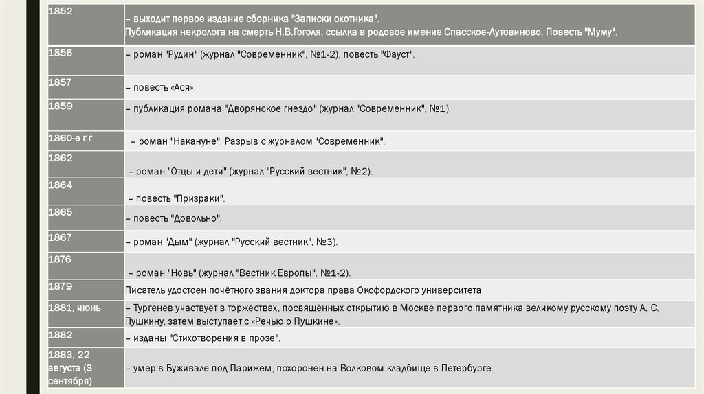 – роман "Рудин" (журнал "Современник", №1-2), повесть "Фауст".