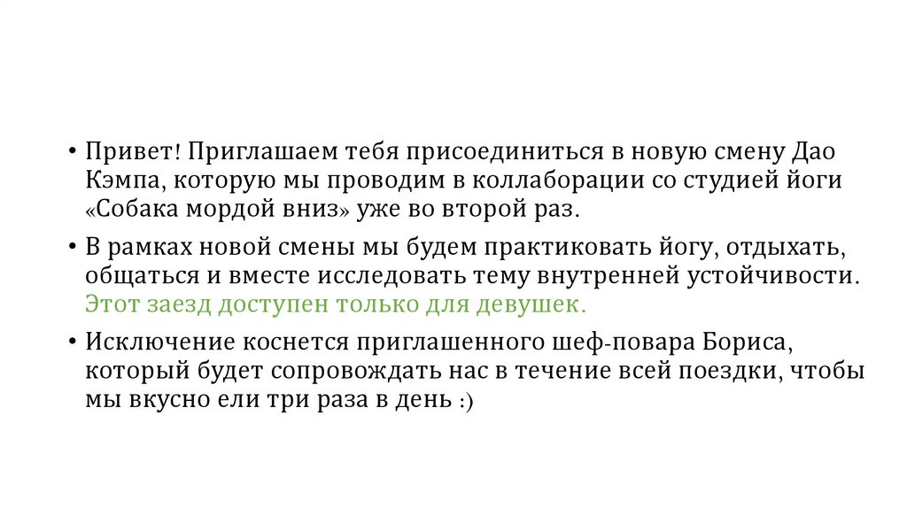 • Привет! Приглашаем тебя присоединиться в новую смену ДаоКэмпа, которую мы проводим в коллаборации со студией йоги