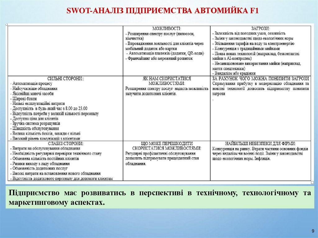 SWOT-АНАЛІЗ ПІДПРИЄМСТВА АВТОМИЙКА F1Підприємство має розвиватись в перспективі в технічному, технологічному та