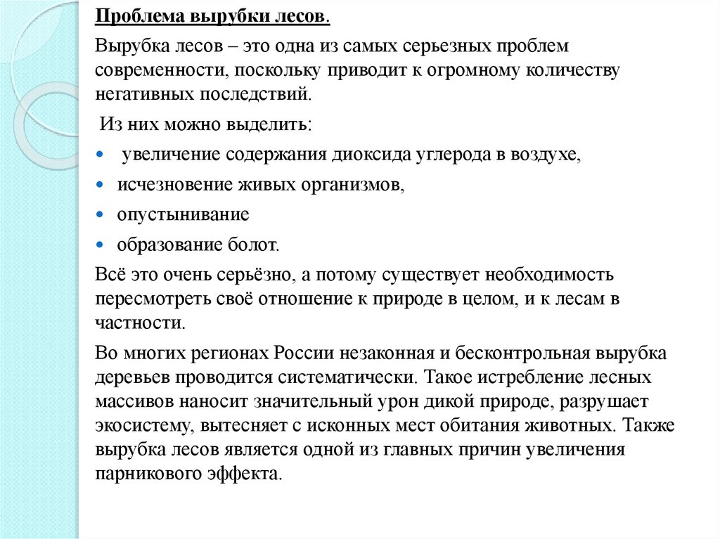 Проблема вырубки лесов.Вырубка лесов – это одна из самых серьезных проблем