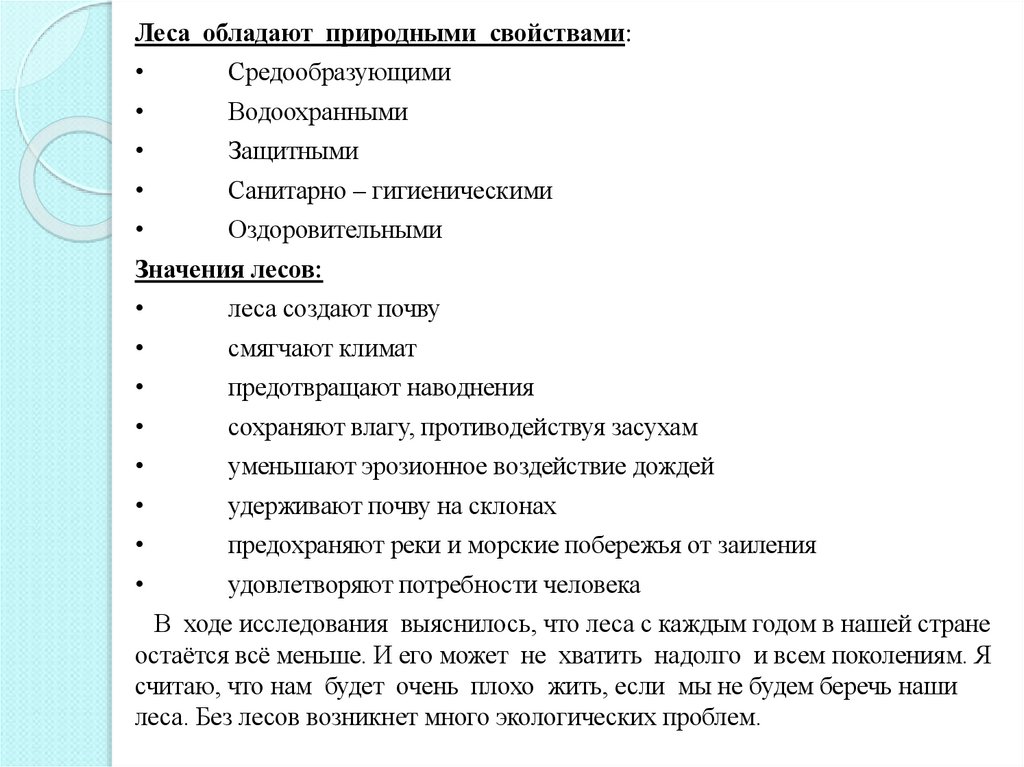 осознать значимость леса для человека и хозяйства страны, не допускать