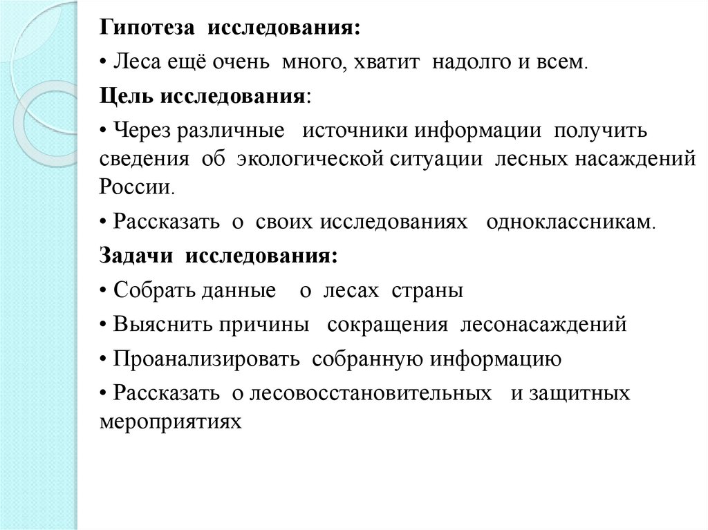 Гипотеза исследования:• Леса ещё очень много, хватит надолго и всем.