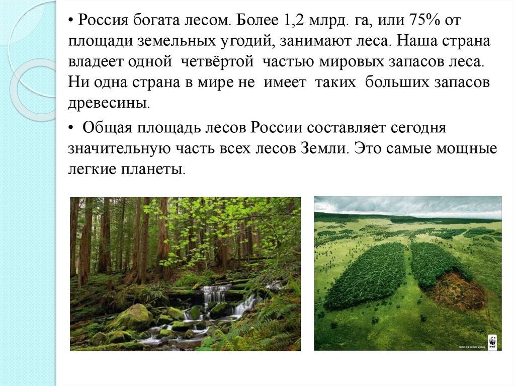 • Россия богата лесом. Более 1,2 млрд. га, или 75% отплощади земельных угодий, занимают леса. Наша страна