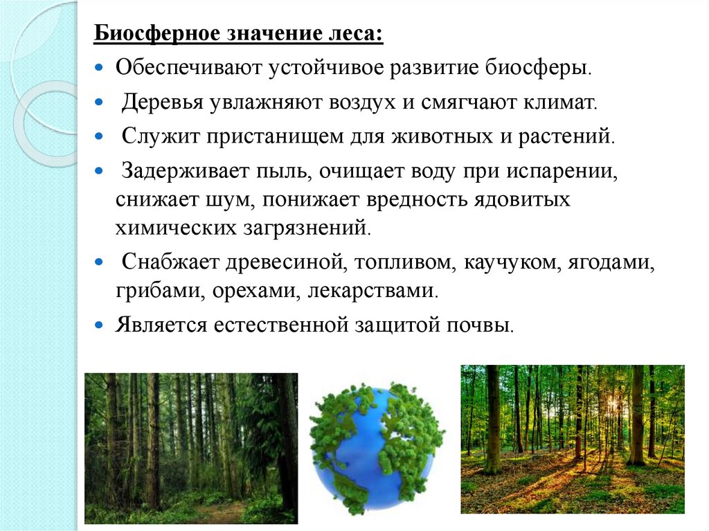 Биосферное значение леса:Обеспечивают устойчивое развитие биосферы.