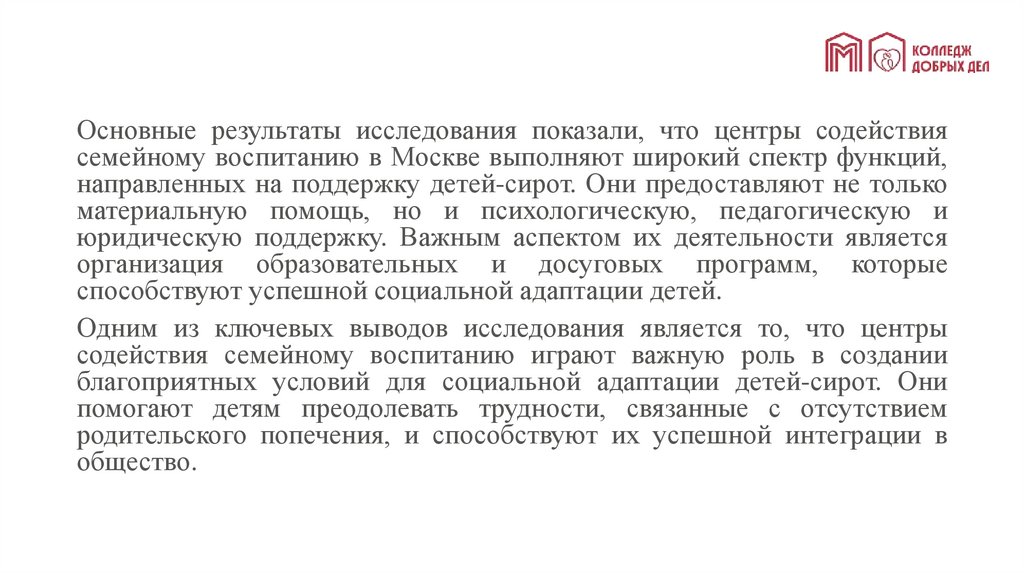 Основные результаты исследования показали, что центры содействиясемейному воспитанию в Москве выполняют широкий спектр функций,