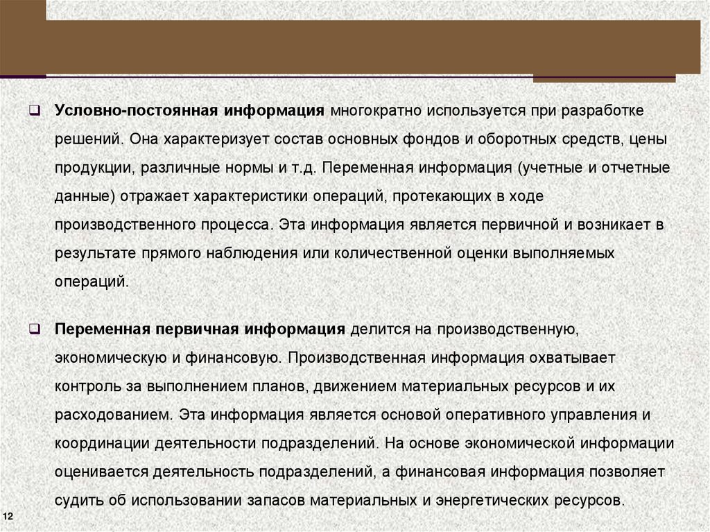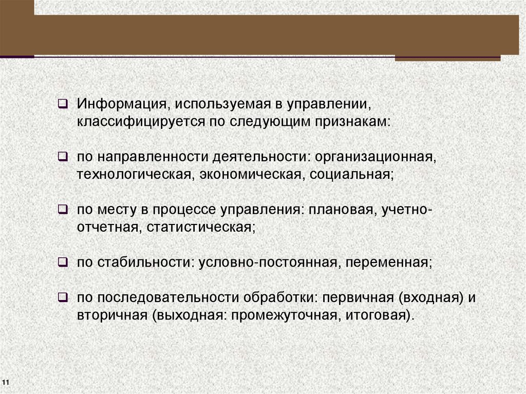 Информация, используемая в управлении,классифицируется по следующим признакам: