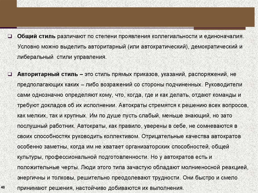 Общий стиль различают по степени проявления коллегиальности и единоначалия.Условно можно выделить авторитарный (или автократический), демократический и