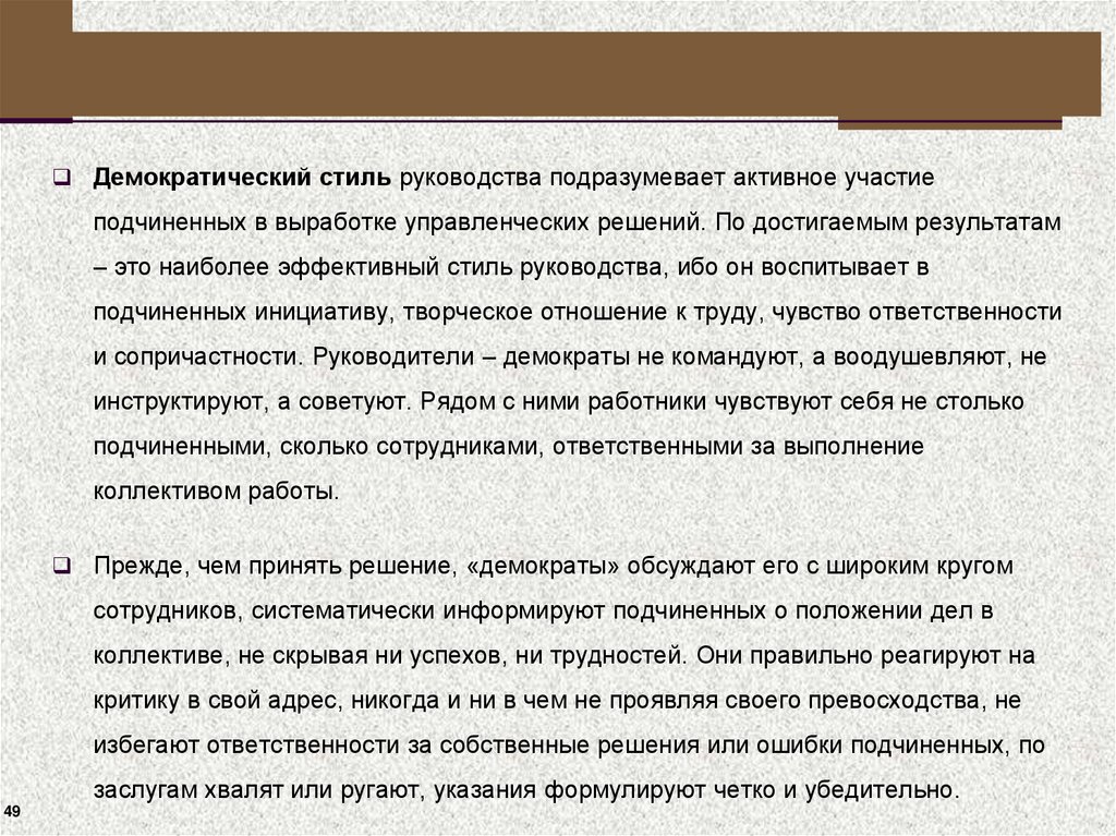 Демократический стиль руководства подразумевает активное участиеподчиненных в выработке управленческих решений. По достигаемым результатам