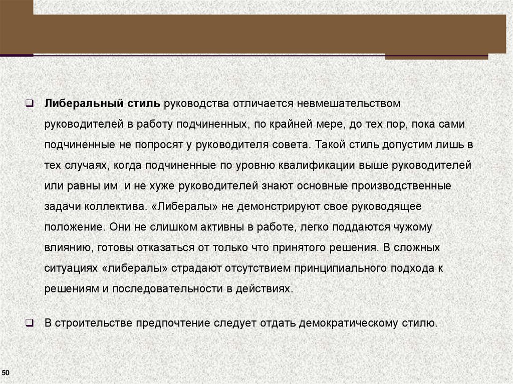 Либеральный стиль руководства отличается невмешательствомруководителей в работу подчиненных, по крайней мере, до тех пор, пока сами