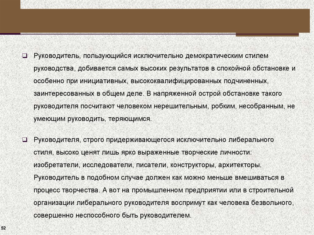 Руководитель, пользующийся исключительно демократическим стилемруководства, добивается самых высоких результатов в спокойной обстановке и