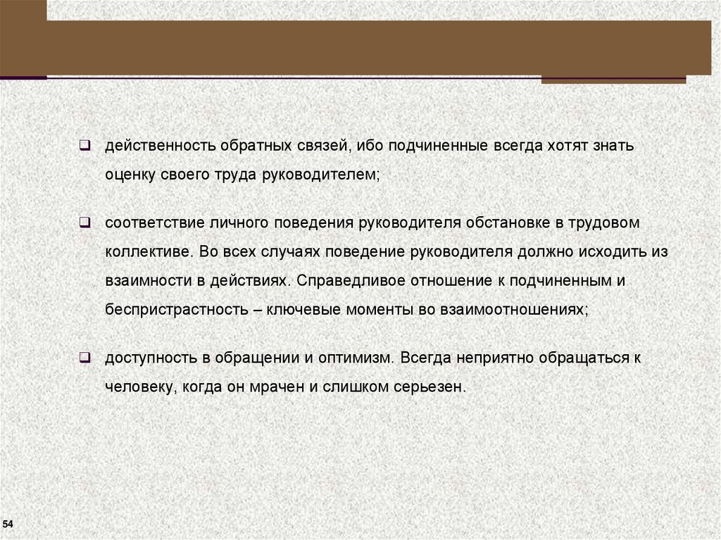 действенность обратных связей, ибо подчиненные всегда хотят знатьоценку своего труда руководителем;