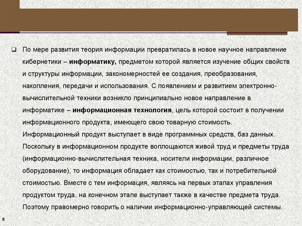 По мере развития теория информации превратилась в новое научное направлениекибернетики – информатику, предметом которой является изучение общих свойств