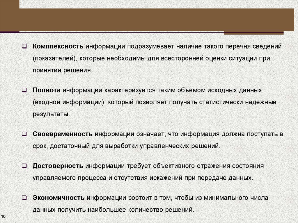 Комплексность информации подразумевает наличие такого перечня сведений(показателей), которые необходимы для всесторонней оценки ситуации при