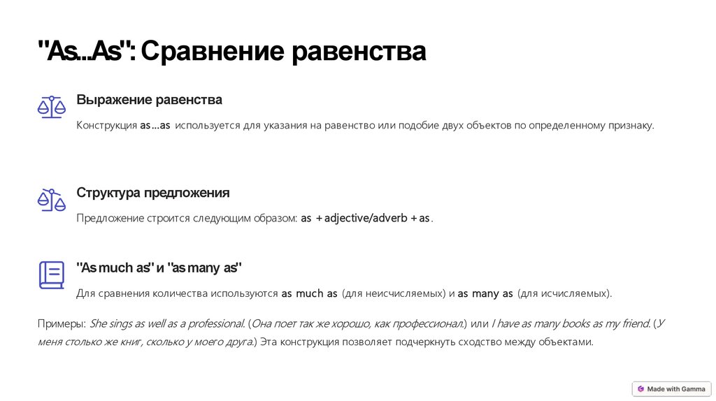 Примеры: She sings as well as a professional. (Она поет так же хорошо, как профессионал.) или I have as many books as my friend. (У