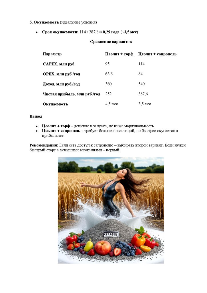 o 60% цеолит + 40% сапропель (базовый вариант).