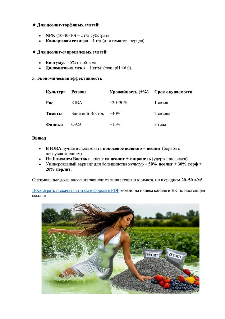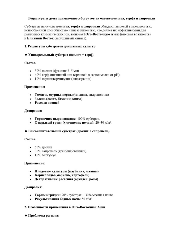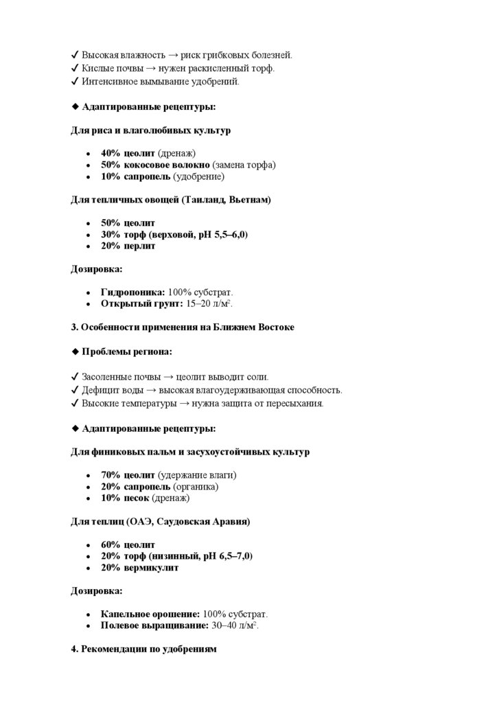 o 70% цеолит + 30% торф – для засушливых условий.