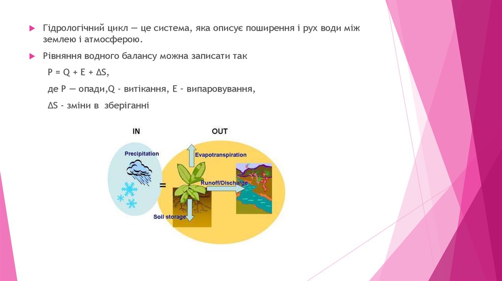 SR = поверхневий стік, E = випаровування, I = просочування,ET = E + випаровування з рослин, N = природнє поповнення