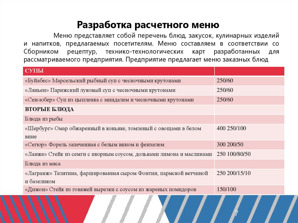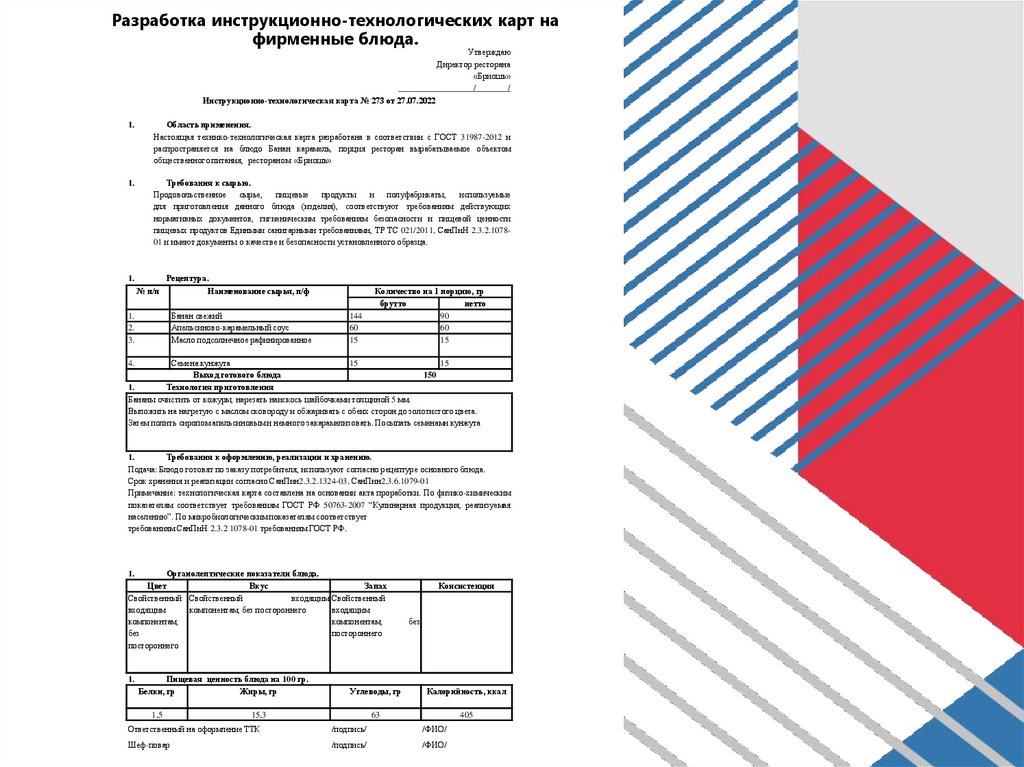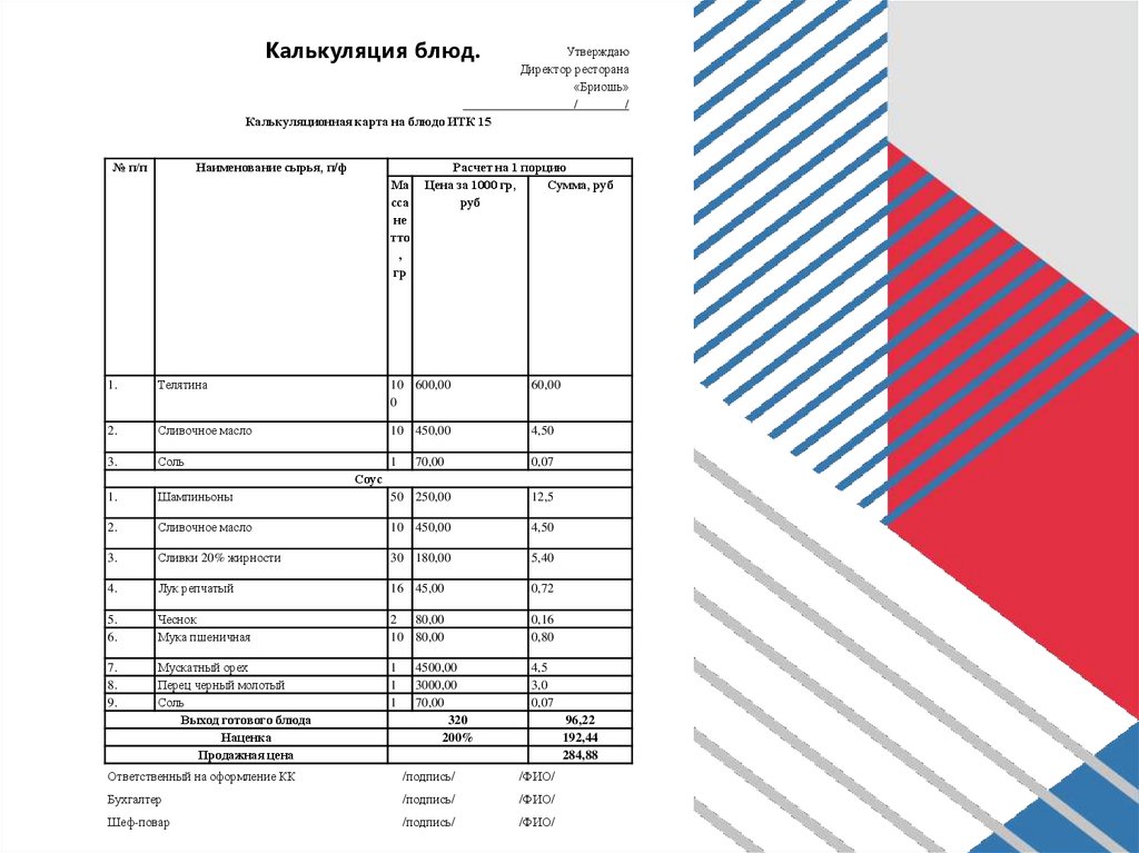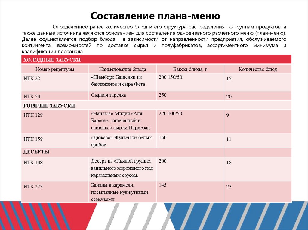 ИТК, калькуляция блюд, расчетное меню предприятия).