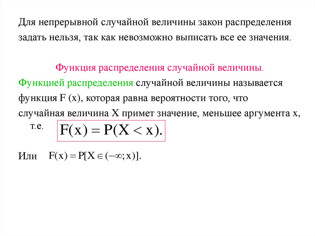 Для непрерывной случайной величины закон распределениязадать нельзя, так как невозможно выписать все ее значения.