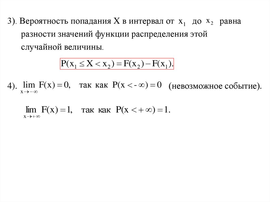 3). Вероятность попадания X в интервал от x1 до x 2 равнаразности значений функции распределения этой