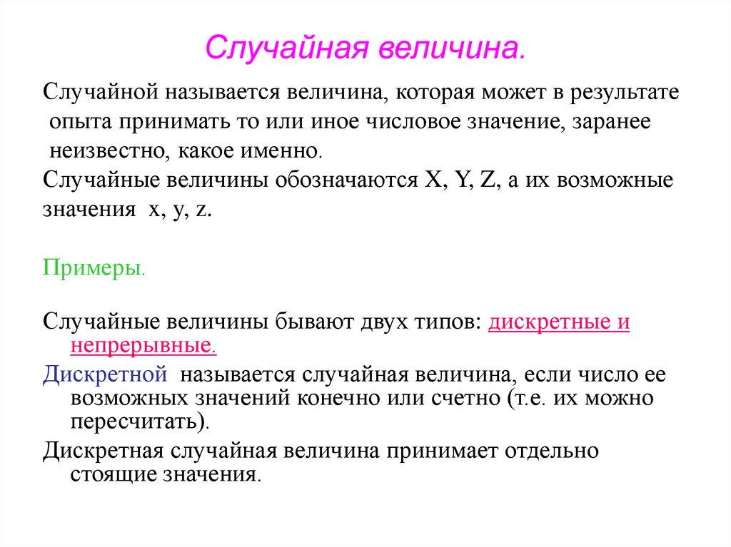 Случайные величины обозначаются X, Y, Z, а их возможные