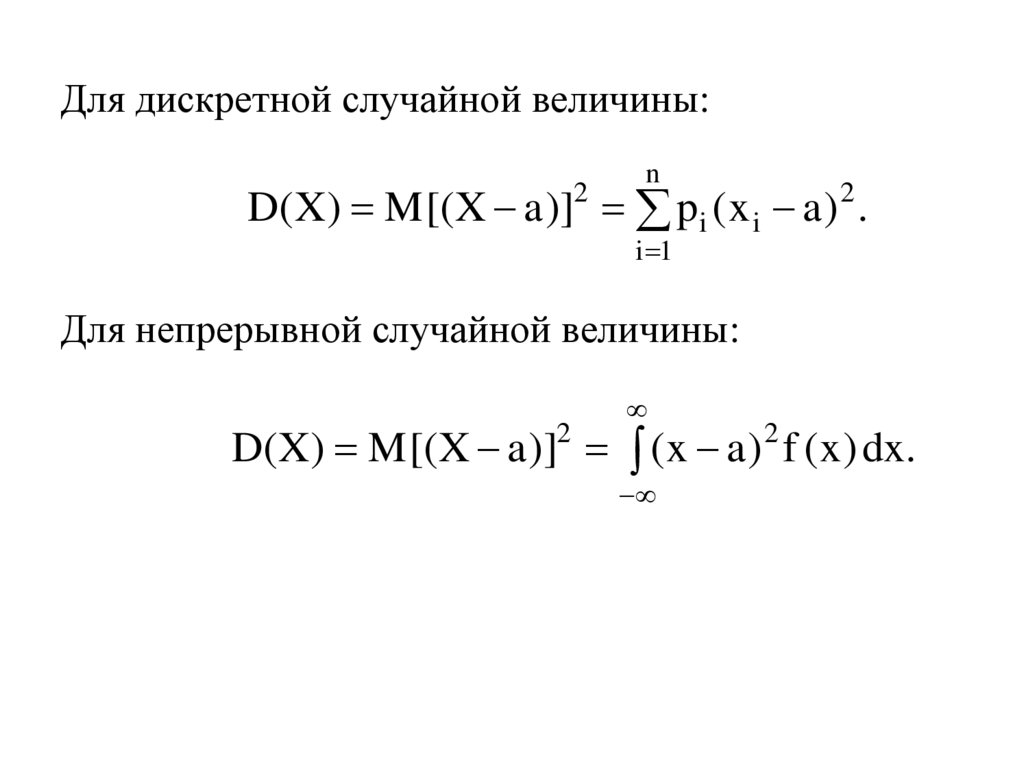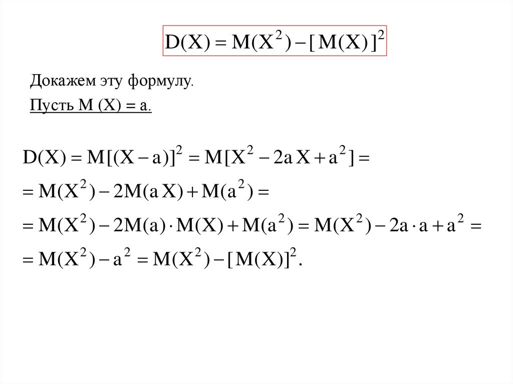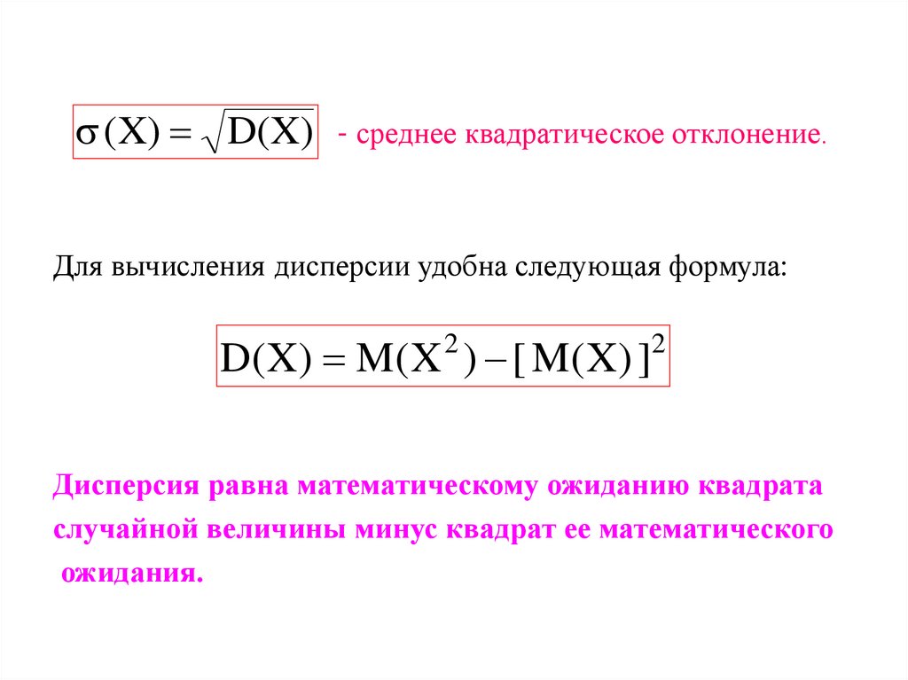 (X) D(X) - среднее квадратическое отклонение.Для вычисления дисперсии удобна следующая формула: