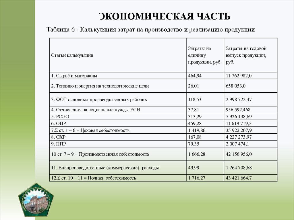 ЭКОНОМИЧЕСКАЯ ЧАСТЬТаблица 6 - Калькуляция затрат на производство и реализацию продукции