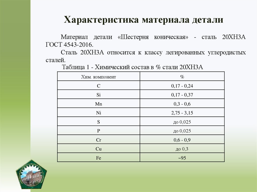 Характеристика материала деталиМатериал детали «Шестерня коническая» - сталь 20ХН3А