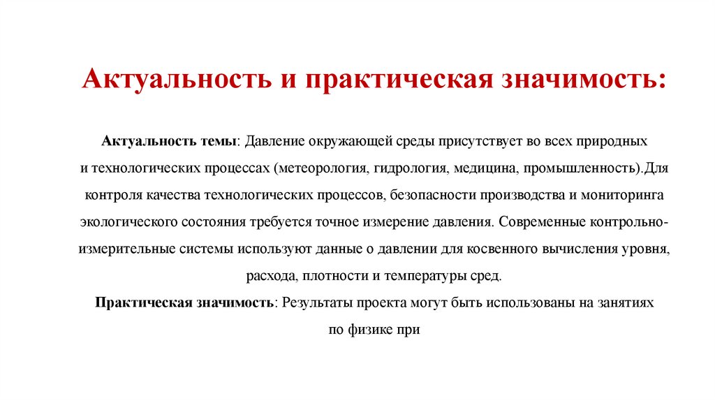 Актуальность и практическая значимость:Актуальность темы: Давление окружающей среды присутствует во всех природных