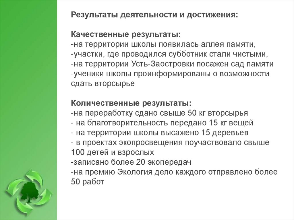 Результаты деятельности и достижения:Качественные результаты: