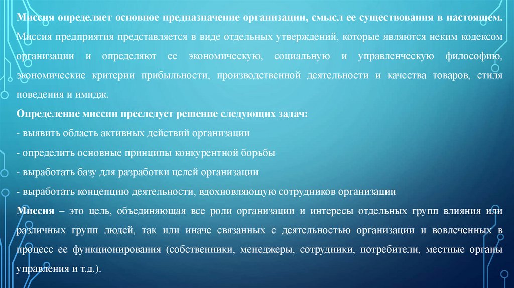 Миссия – это цель, объединяющая все роли организации и интересы отдельных групп влияния или