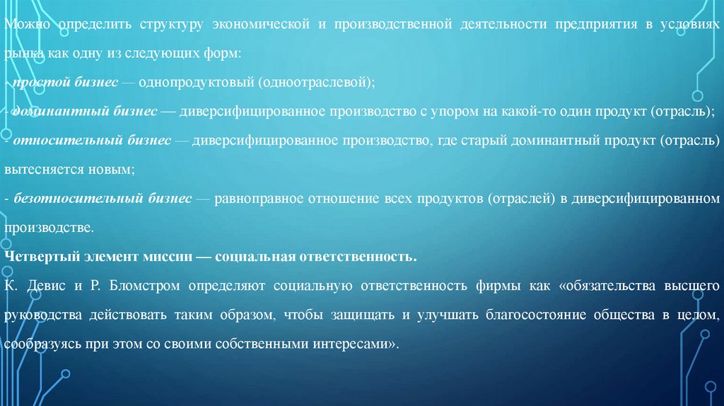 К. Девис и Р. Бломстром определяют социальную ответственность фирмы как «обязательства высшего