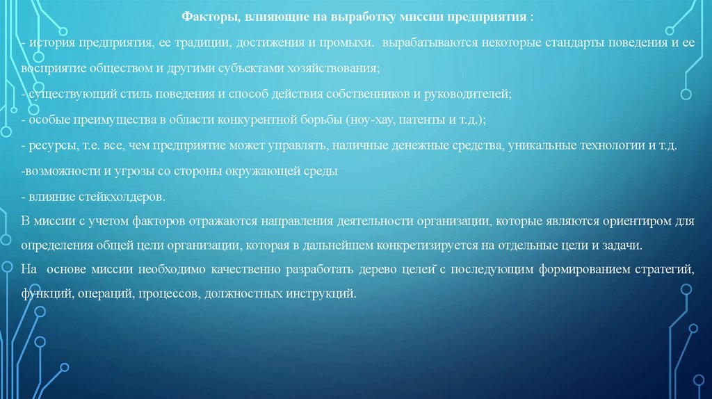 Факторы, влияющие на выработку миссии предприятия :- история предприятия, ее традиции, достижения и промыхи. вырабатываются некоторые стандарты поведения и ее
