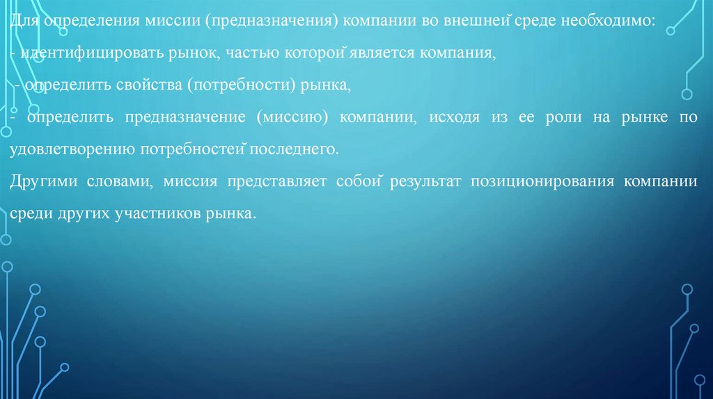 Для определения миссии (предназначения) компании во внешней среде необходимо:- идентифицировать рынок, частью которой является компания,