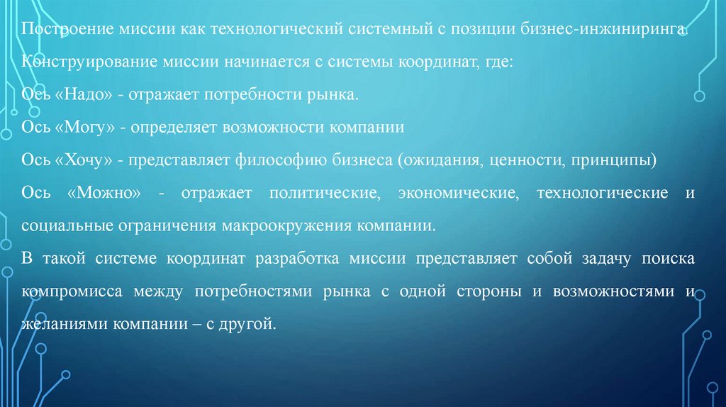 Построение миссии как технологический системный с позиции бизнес-инжиниринга.Конструирование миссии начинается с системы координат, где: