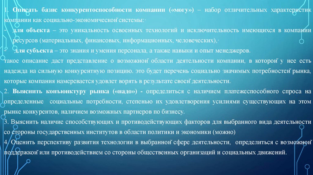 1. Описать базис конкурентоспособности компании («могу») – набор отличительных характеристиккомпании как социально-экономической системы:·