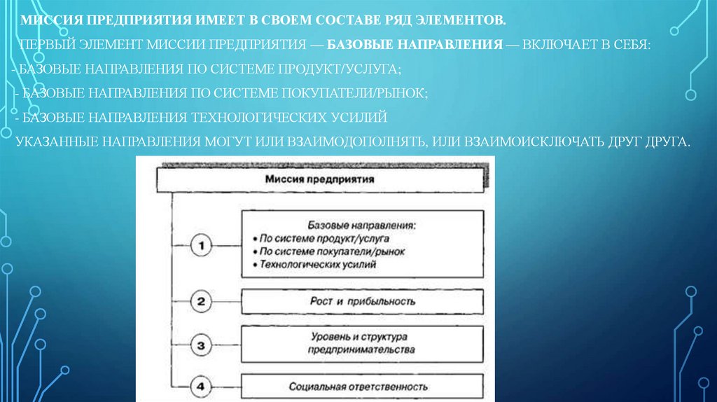 МИССИЯ ПРЕДПРИЯТИЯ ИМЕЕТ В СВОЕМ СОСТАВЕ РЯД ЭЛЕМЕНТОВ.ПЕРВЫЙ ЭЛЕМЕНТ МИССИИ ПРЕДПРИЯТИЯ — БАЗОВЫЕ НАПРАВЛЕНИЯ — ВКЛЮЧАЕТ В СЕБЯ: