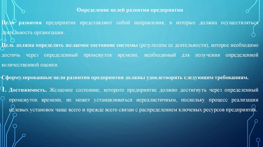 1. Достижимость. Желаемое состояние, которого предприятие должно достигнуть через определенный