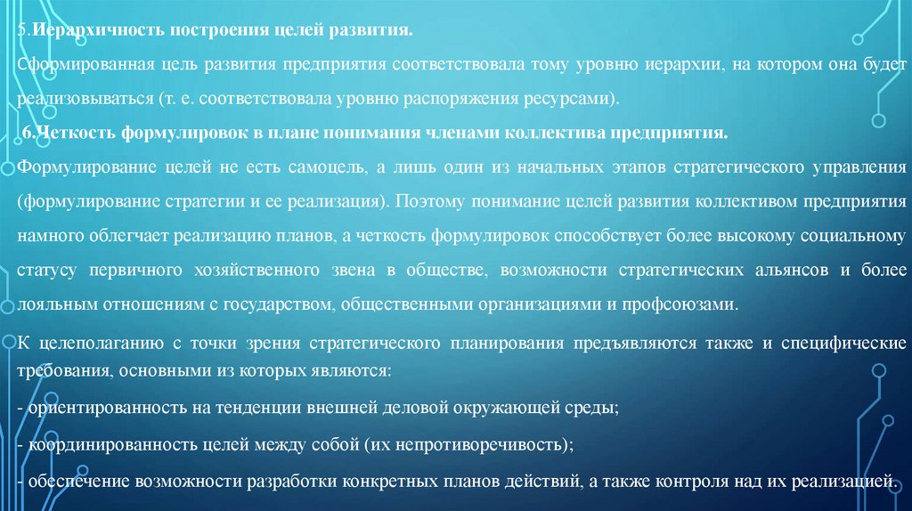 5.Иерархичность построения целей развития.Сформированная цель развития предприятия соответствовала тому уровню иерархии, на котором она будет