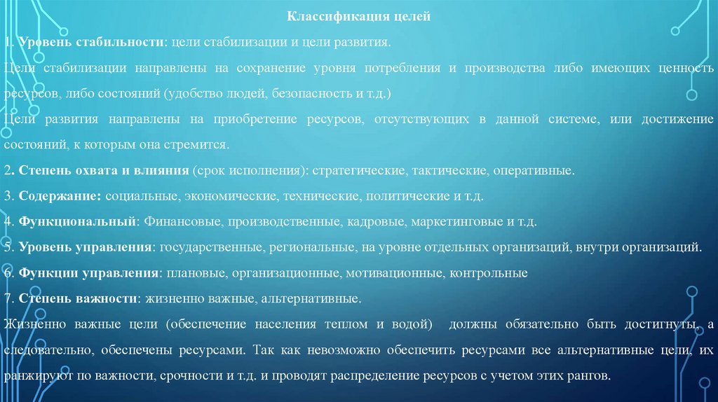 Классификация целей1. Уровень стабильности: цели стабилизации и цели развития.