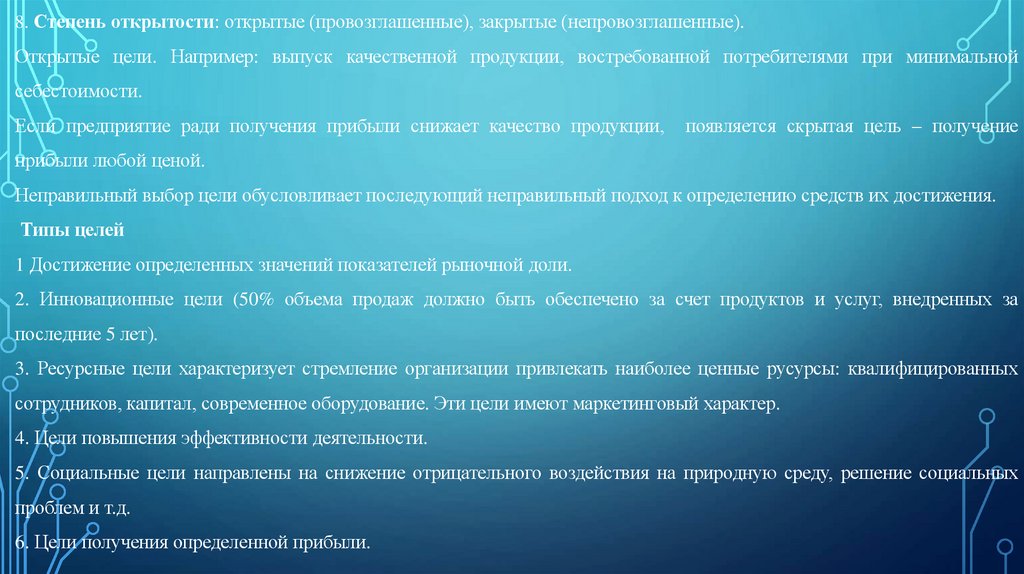 8. Степень открытости: открытые (провозглашенные), закрытые (непровозглашенные).Открытые цели. Например: выпуск качественной продукции, востребованной потребителями при минимальной