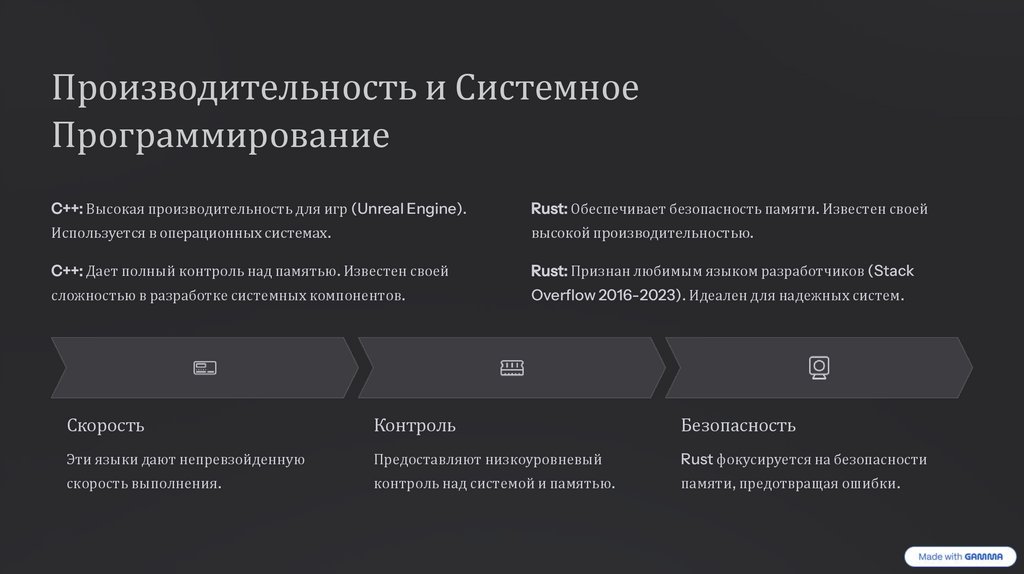 Rust: Обеспечивает безопасность памяти. Известен своей