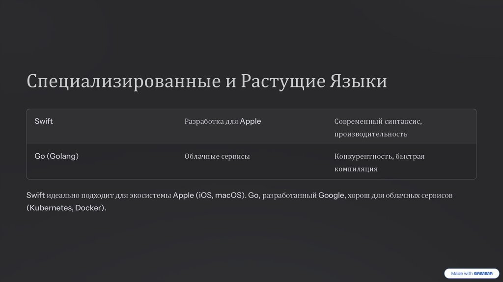 Swift идеально подходит для экосистемы Apple (iOS, macOS). Go, разработанный Google, хорош для облачных сервисов