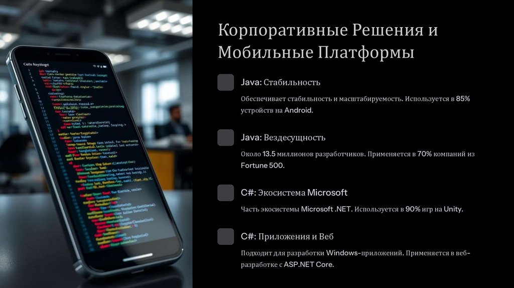 Подходит для разработки Windows-приложений. Применяется в вебразработке с ASP.NET Core.
