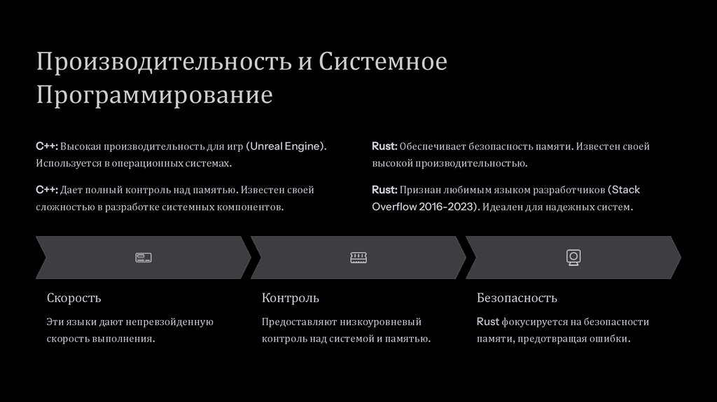 Rust: Обеспечивает безопасность памяти. Известен своей