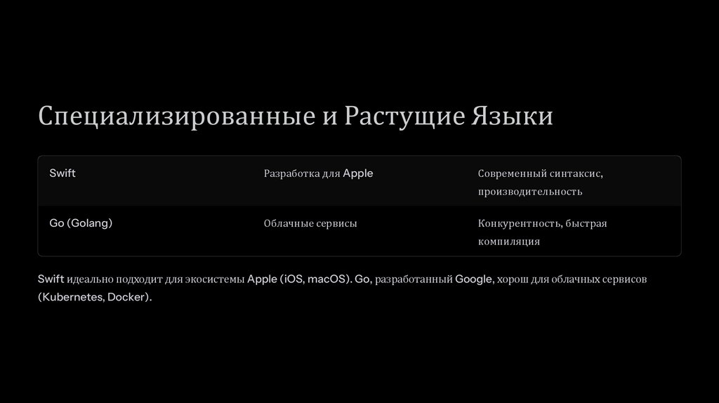 Swift идеально подходит для экосистемы Apple (iOS, macOS). Go, разработанный Google, хорош для облачных сервисов