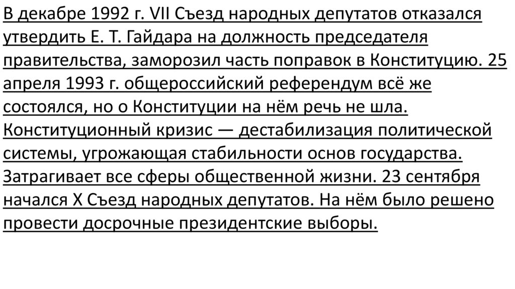 В декабре 1992 г. VII Съезд народных депутатов отказалсяутвердить Е. Т. Гайдара на должность председателя