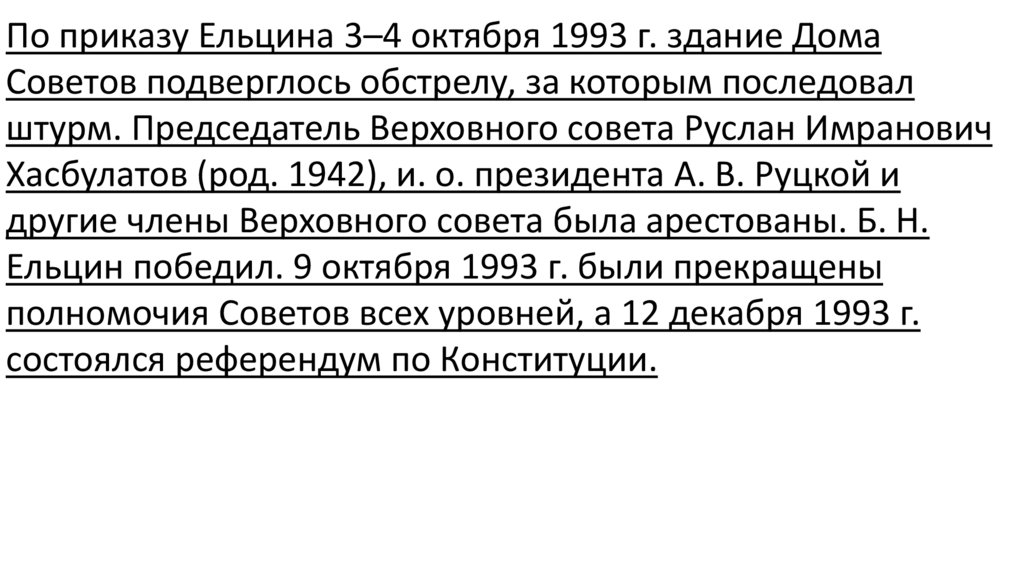 По приказу Ельцина 3–4 октября 1993 г. здание ДомаСоветов подверглось обстрелу, за которым последовал