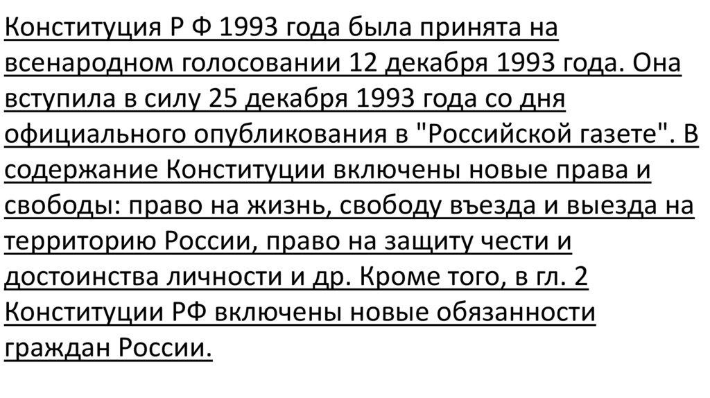Конституция Р Ф 1993 года была принята навсенародном голосовании 12 декабря 1993 года. Она
