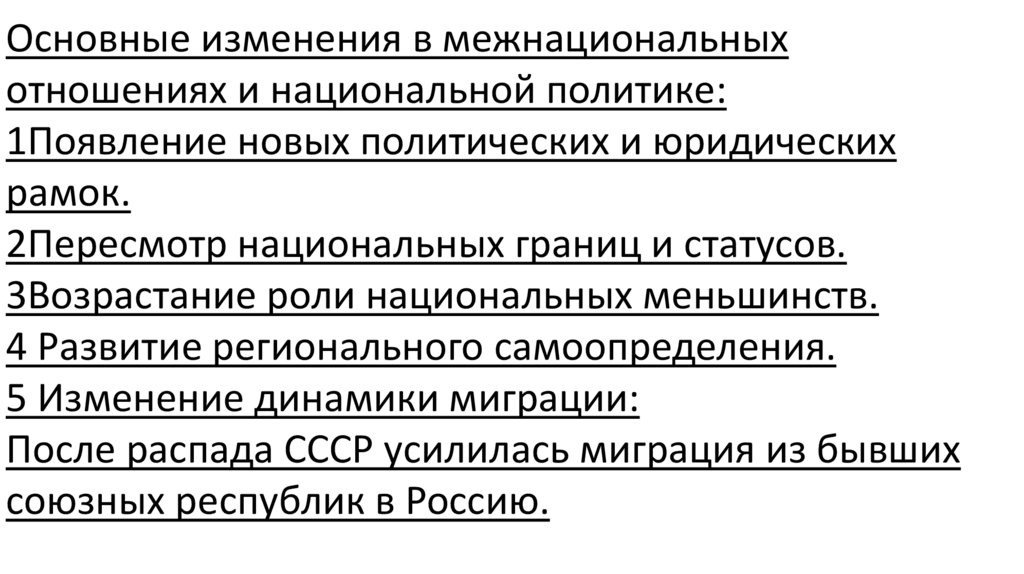 Основные изменения в межнациональныхотношениях и национальной политике: